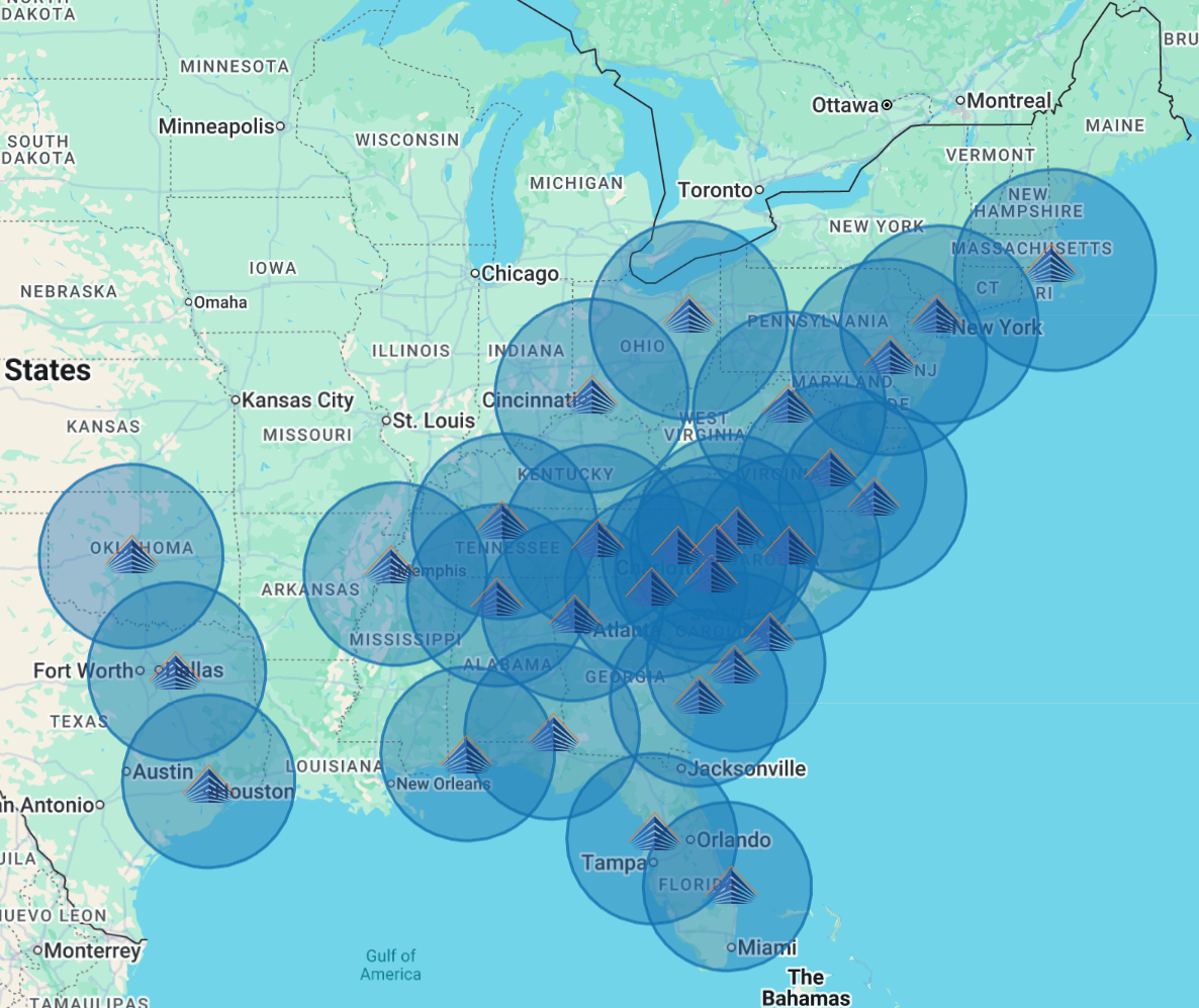 Each circle marks a 150-mile radius from one of our shops. For Production re-roofs and new construction, we travel the entire country!